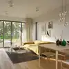 The V1 house saturates the entire space with functionality in an extraordinary manner. The living area, which consists of a bright living room, dining room and open kitchen, has been designed on the ground floor of the building in order to enjoy the view through panoramic windows as much as possible. The private part was fully located on the second floor of the house. The intimate area of the household consists of three bedrooms, a wardrobe and a bathroom.